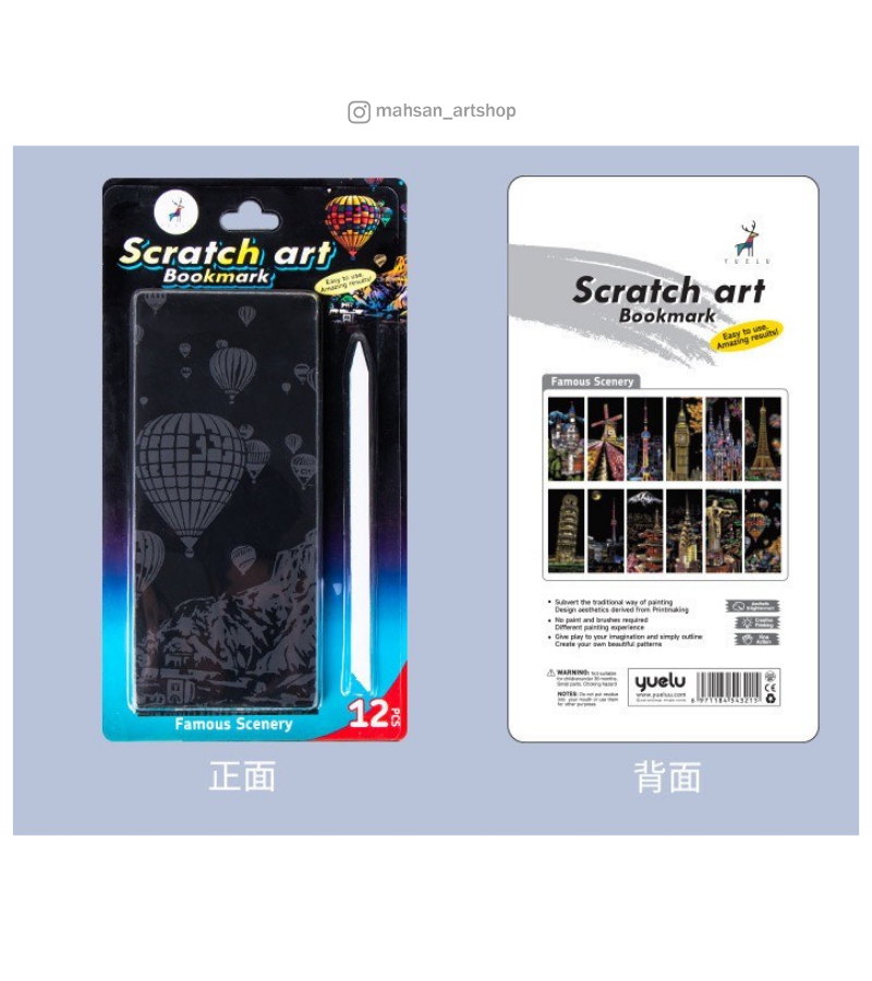 در هر پک، ۱۲ عدد برگه اسکرچ به سایز ۱۵*۷ به همراه یک قلم خراش قرار دارد. طرحها بهصورت راهنما روی صفحهی مشکی چاپ شدهاند و شما با قلم مخصوص، قسمتهای مشخصشده را خراش میدهید تا رنگهای درخشان و جذاب زیر سطح نمایان شوند.