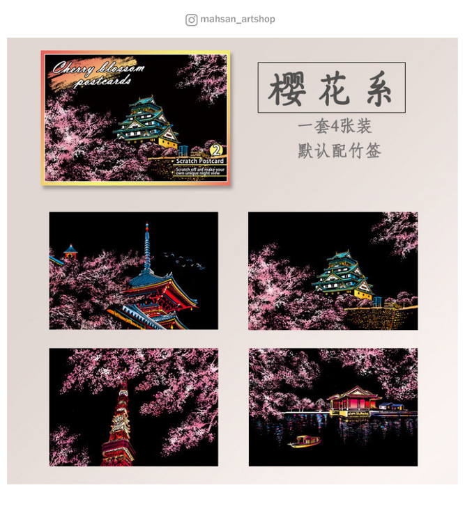 در هر پک، ۴ عدد برگه اسکرچ به سایز A5 به همراه یک قلم خراش قرار دارد. طرحها بهصورت راهنما روی صفحهی مشکی چاپ شدهاند و شما با قلم مخصوص، قسمتهای مشخصشده (طوسی رنگ) را خراش میدهید تا رنگهای درخشان و جذاب زیر سطح نمایان شوند.