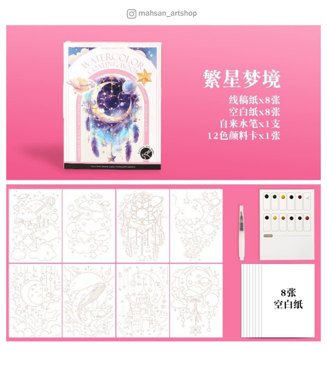 این پک شامل 16 برگه (8 برگه طرح دار و 8 برگهخام برای طراحی آزاد)، پالت رنگی آماده و قلممو مخزندار است؛ بنابراین همه چیز برای شروع یک تجربهی خلاقانه فراهم است.