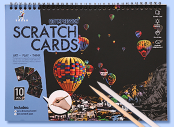 در این مدل دفتری، 10 عدد برگه اسکرچ به سایز A4 به همراه 2 قلم خراش قرار دارد. طرحها بهصورت راهنما روی صفحهی مشکی چاپ شدهاند و شما با قلم مخصوص، قسمتهای مشخصشده (خاکستری رنگ) را خراش میدهید تا رنگهای درخشان و جذاب زیر سطح نمایان شوند. در واقع شما به جای رنگآمیزی، با تکنیک خراش دادن، تصویر نهایی را ظاهر میکنید.